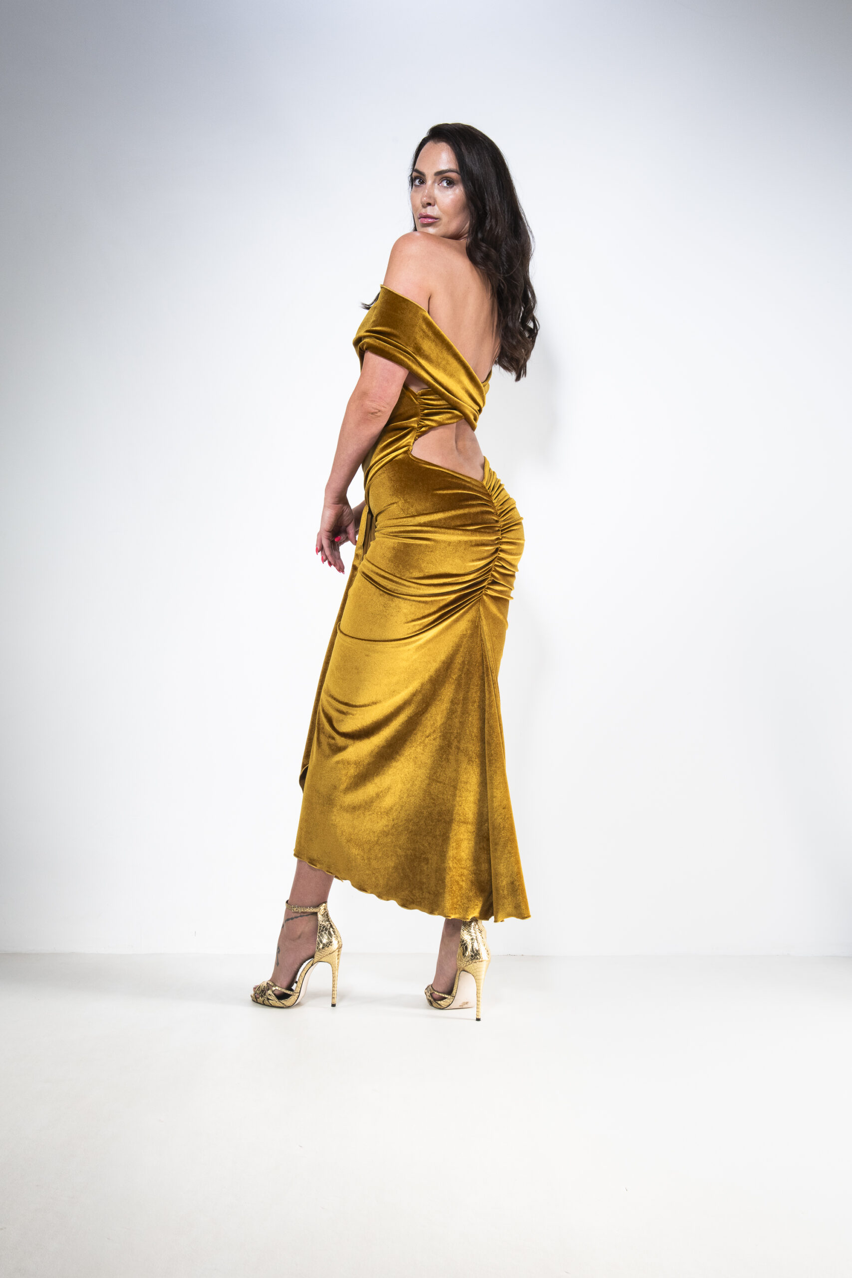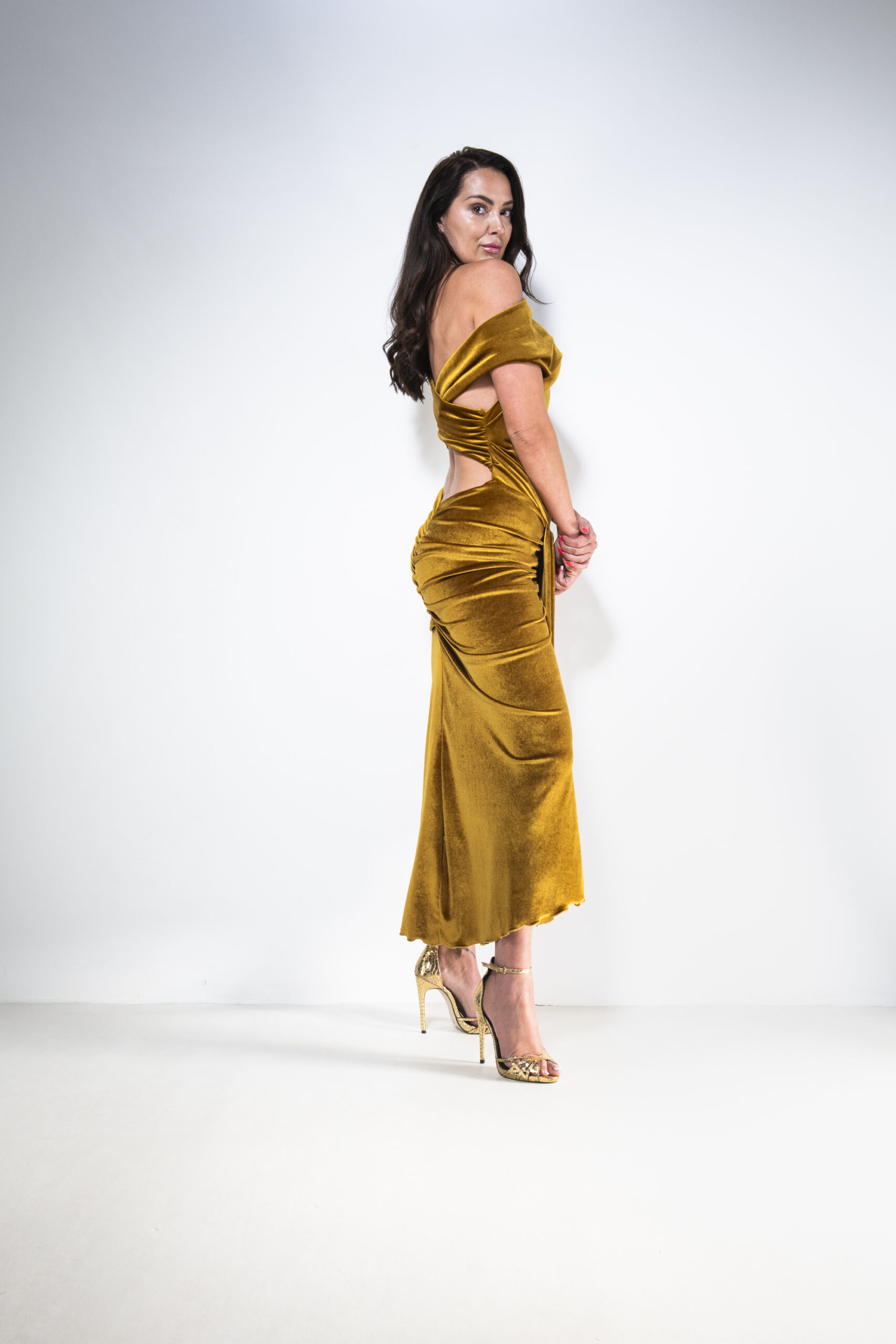 Kevan Jon’s Daisy Bardot Midi features a stunning off the shoulder detail that crosses over at the back creating a stunning back less detail to the dress. Ruched detailing down the back of the dress creates a flattering look along with the drape central to the front of the dress adds an elegant feel.