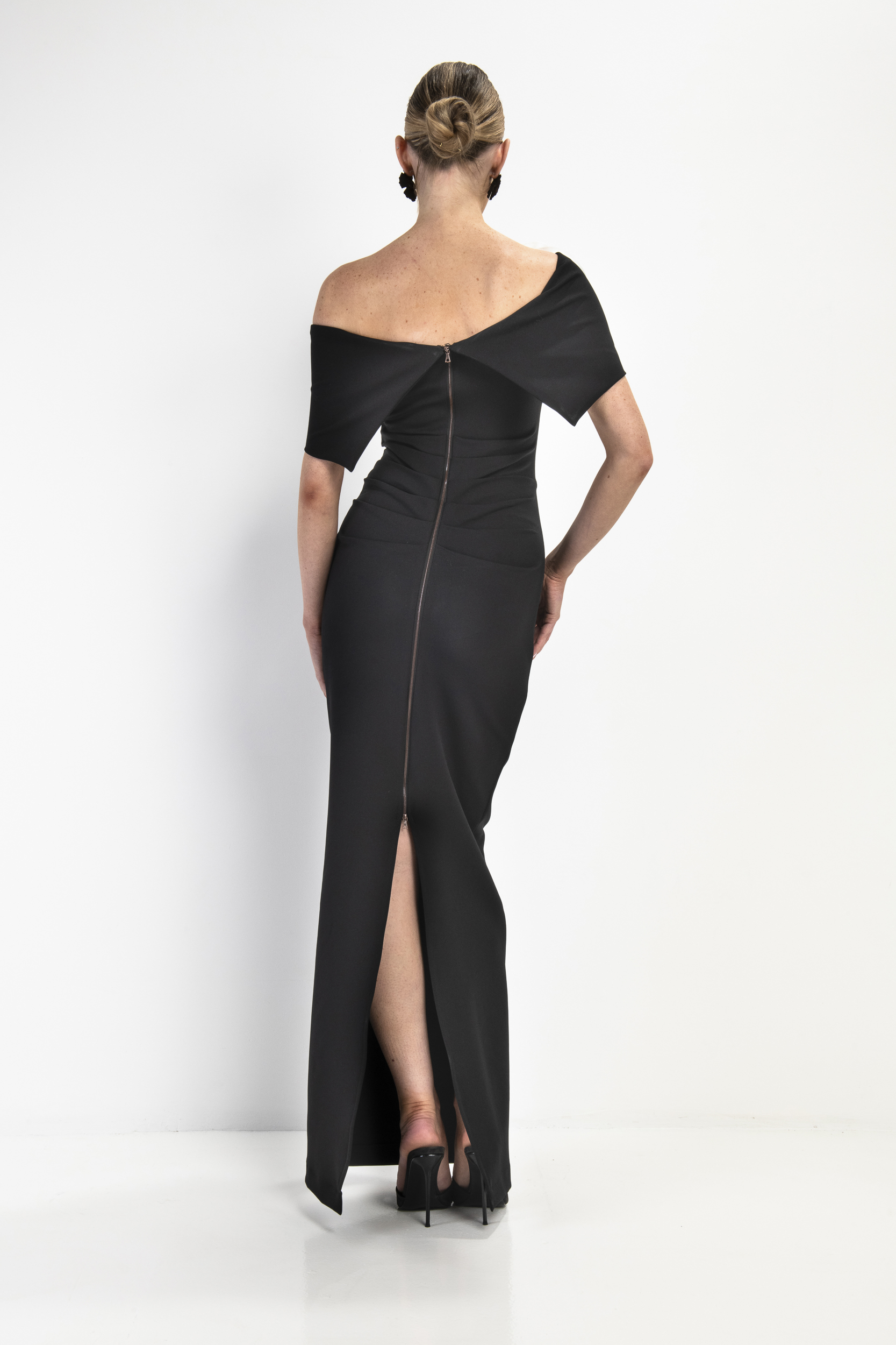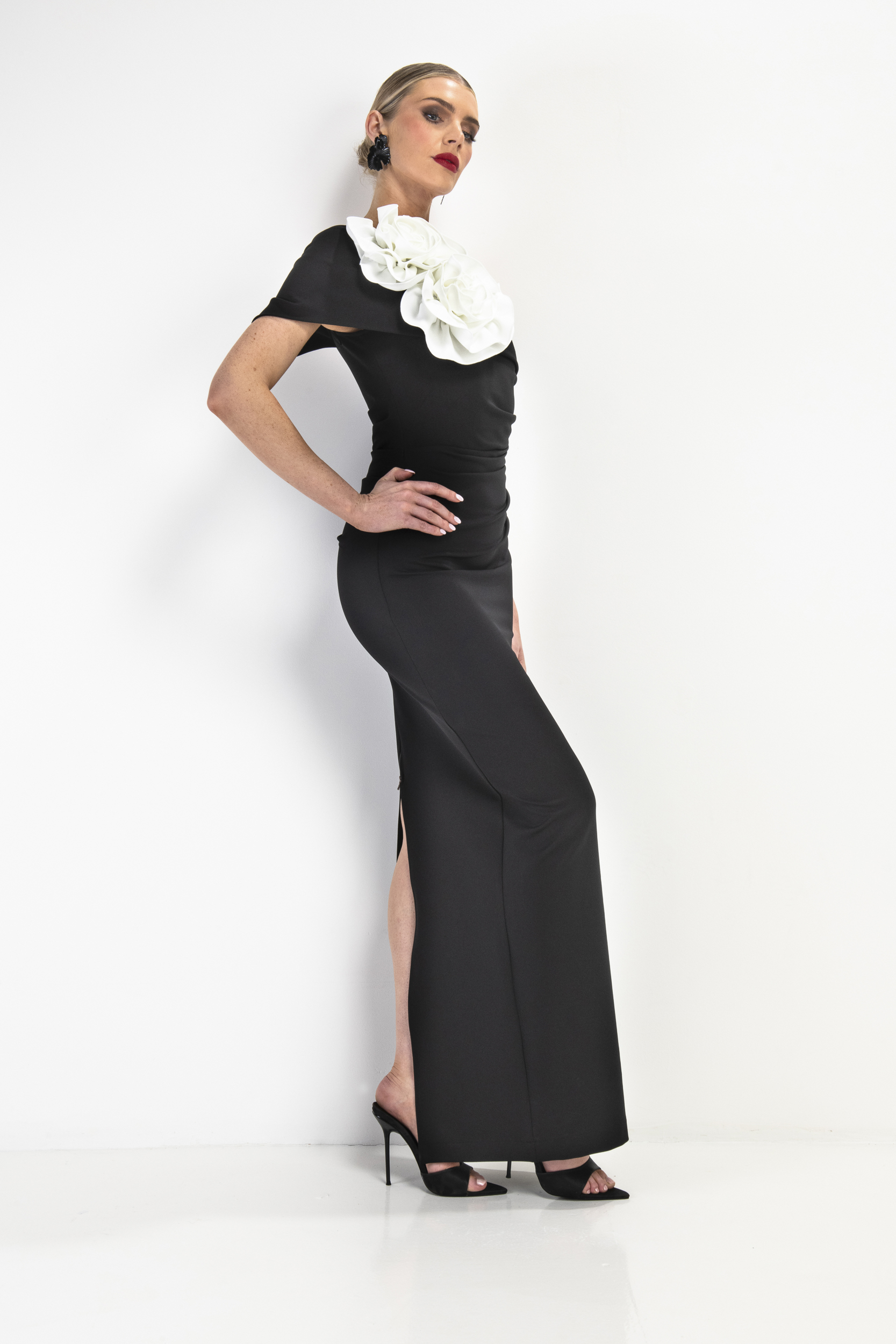 Kevan Jon, Kris Bardot Maxi dress features a folded over front bardot style that can be worn completely off the shoulder or a little higher but provides coverage to the tops of the arms. The addition of the floral corsage adds a touch of drama to a classic fitted dress.