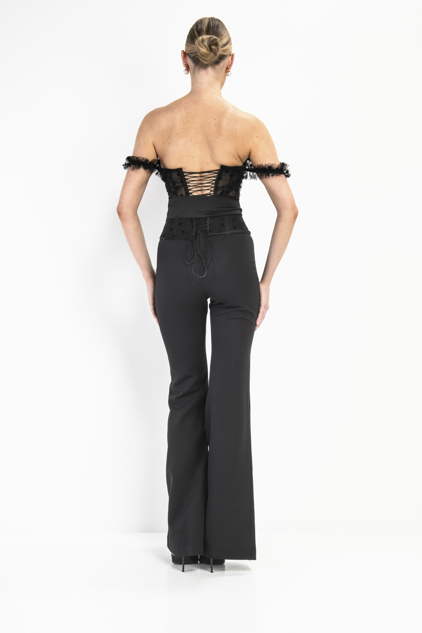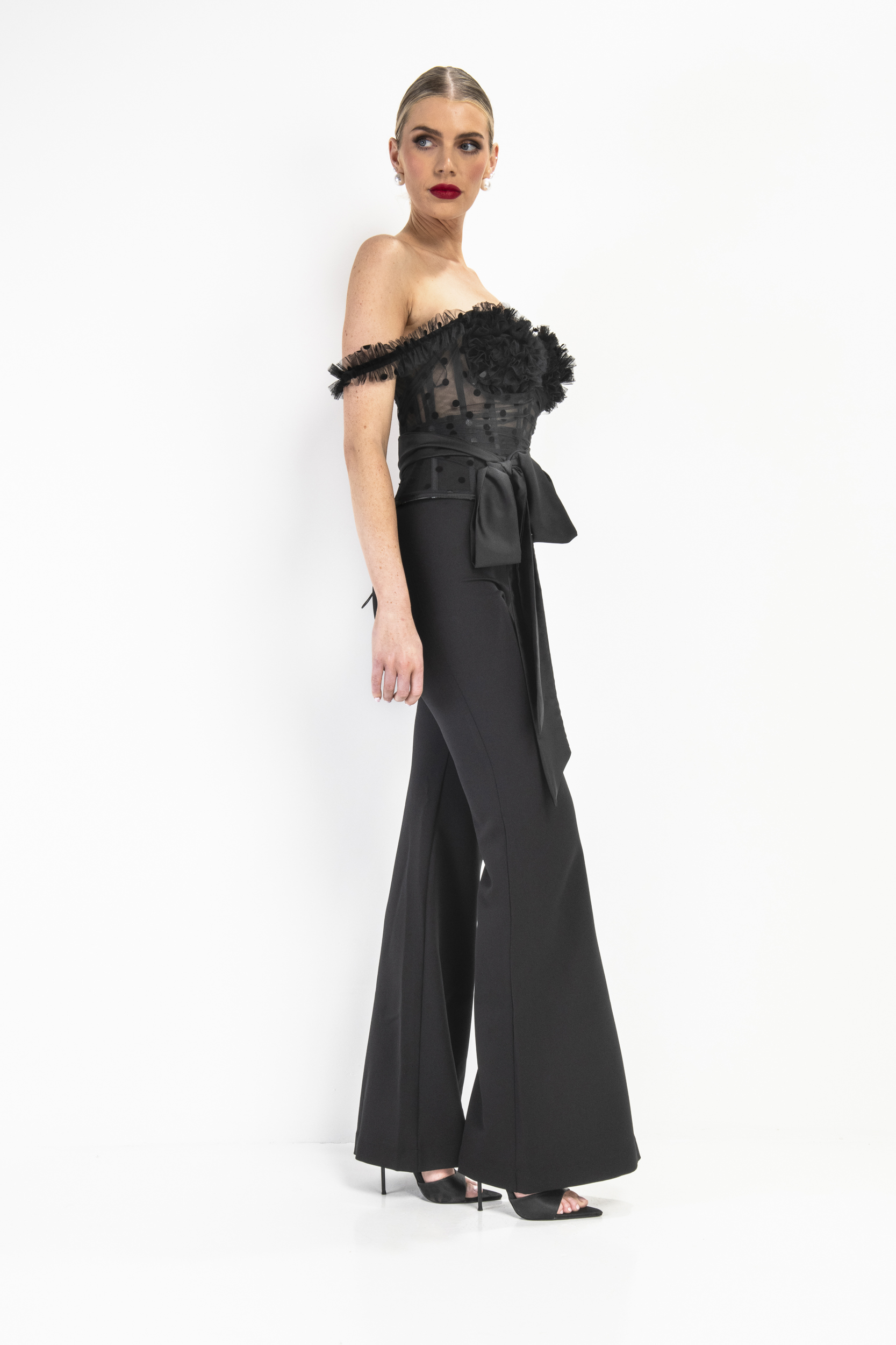 Kevan Jon Lelita Corset Top. Stunning off the shoulder corset and lace back detail is a perfect addition for any glamorous occasion. An additional fabric belt helps to create a flattering waistline.