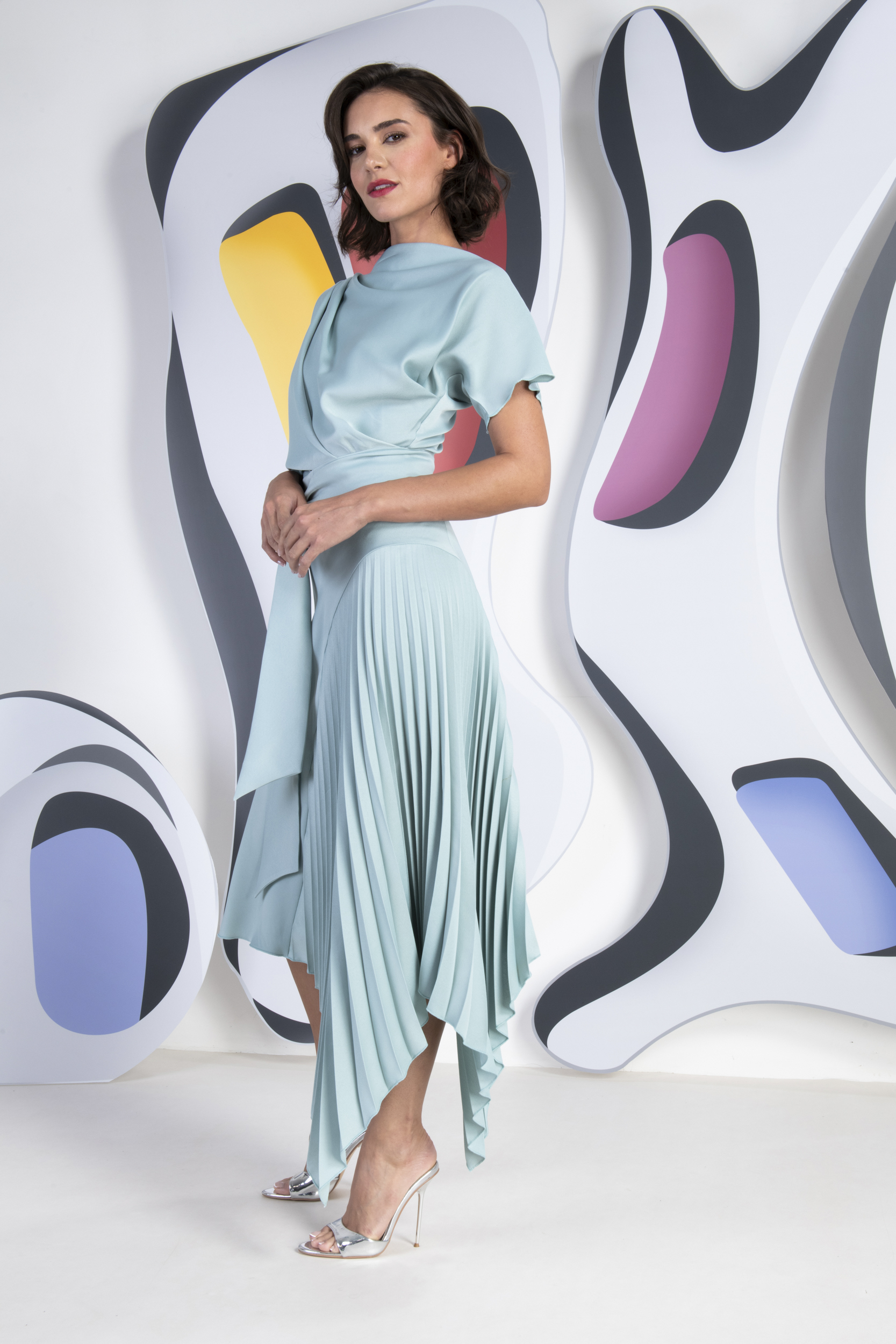 Kevan Jon’s Mila Pleat Knee dress has a soft draped bodice, along with a skirt that falls to an asymmetric hemline with a pleated insert to the left side giving added interest to this stunning dress. The addition of a removable sash allows you to accentuate the waist line.