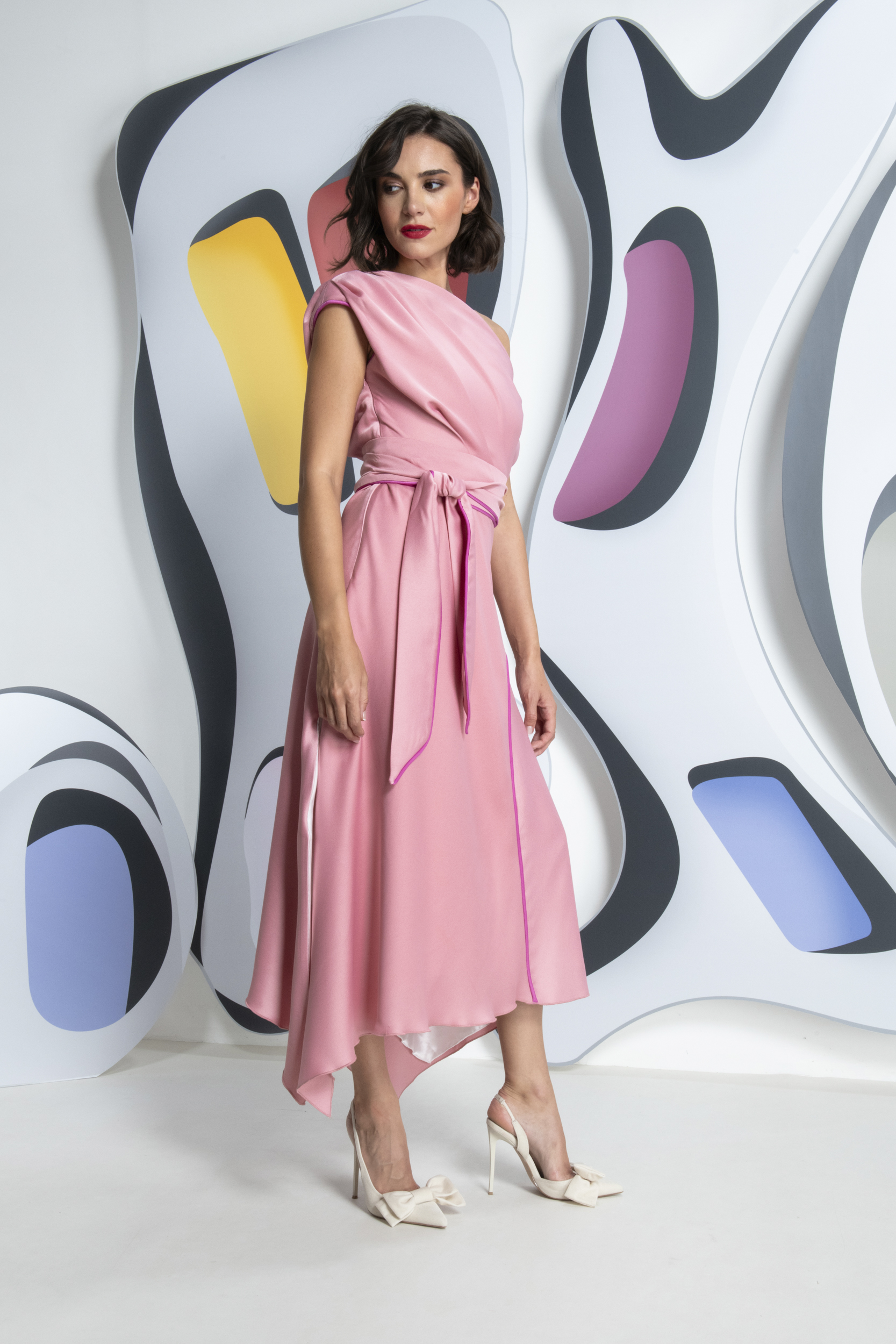 Kevan Jon’s Rosellon Bardot Drape features gorgeous bodice that sits on one shoulder and elegantly drapes down the other, a beautiful belt to tie and cinch the waist. All finished off with a pop of coloured piping around the seams.